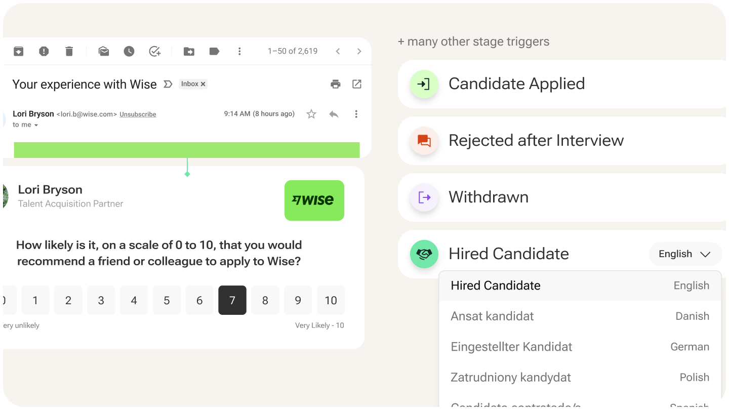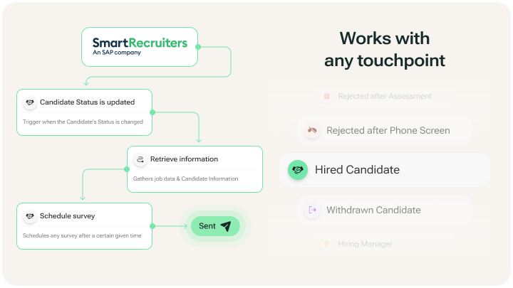 Starred connects directly to your SmartRecruiters workflows. Set it up in minutes, no developer needed. Trigger surveys automatically and enrich responses with your existing SmartRecruiters data for effortless segmentation. Our Customer Success team supports you at every step.
